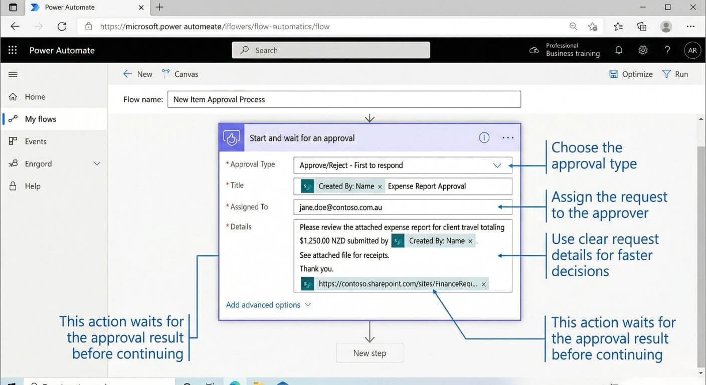 Note: menu labels and connector names can vary slightly depending on your Microsoft environment and licensing. Keep the first version of your approval flow simple, then expand it once the core process is working well.