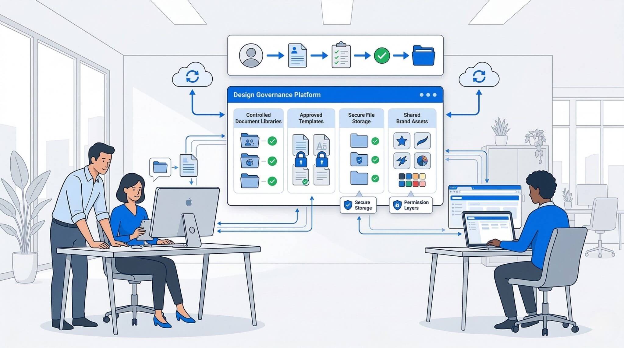 Need to think about governance, permissions, version control, approved template ownership, and where final files live after design is done.