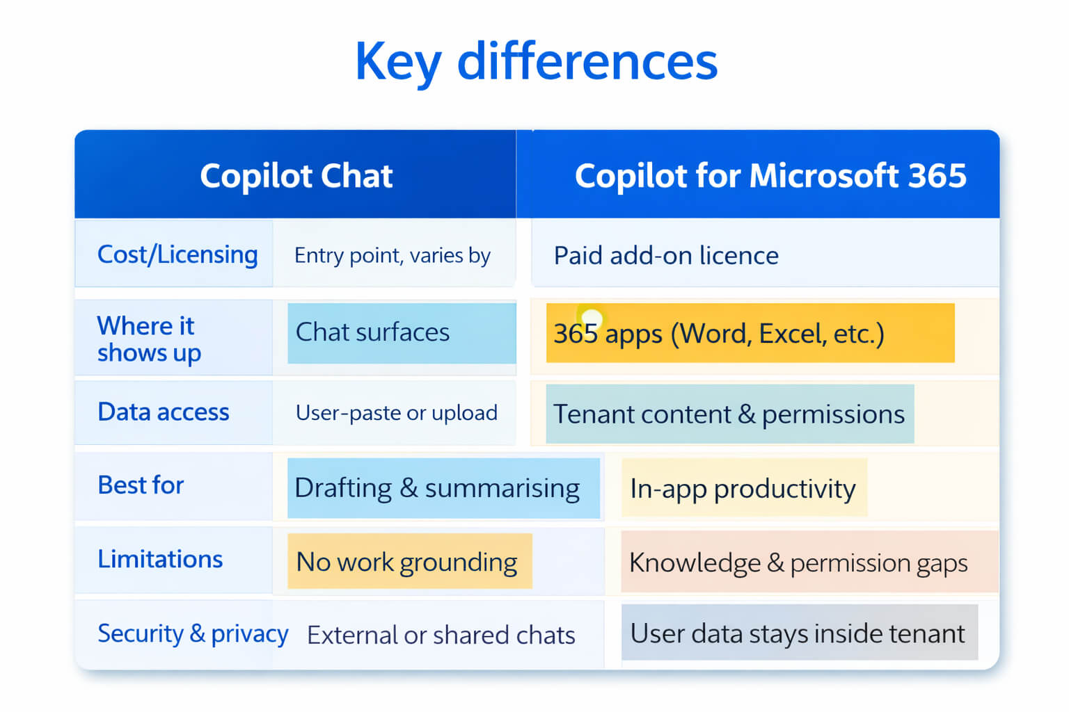 Copilot Chat helps you create great outputs from inputs you provide. Copilot for Microsoft 365 helps you create great outputs inside Microsoft 365 apps, potentially grounded in your work content, and still governed by permissions.