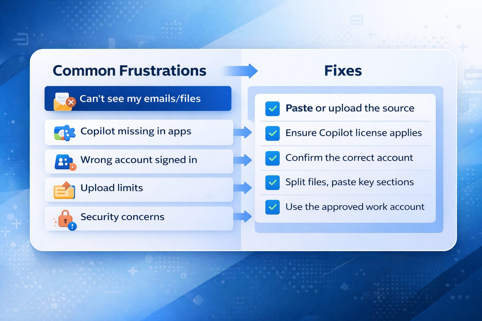 The good news is that Copilot frustration patterns are remarkably consistent. Once you know the “why”, the fixes are straightforward. The common complaints usually fall into five buckets: missing context, missing button, mixed accounts, upload limits, and trust questions.