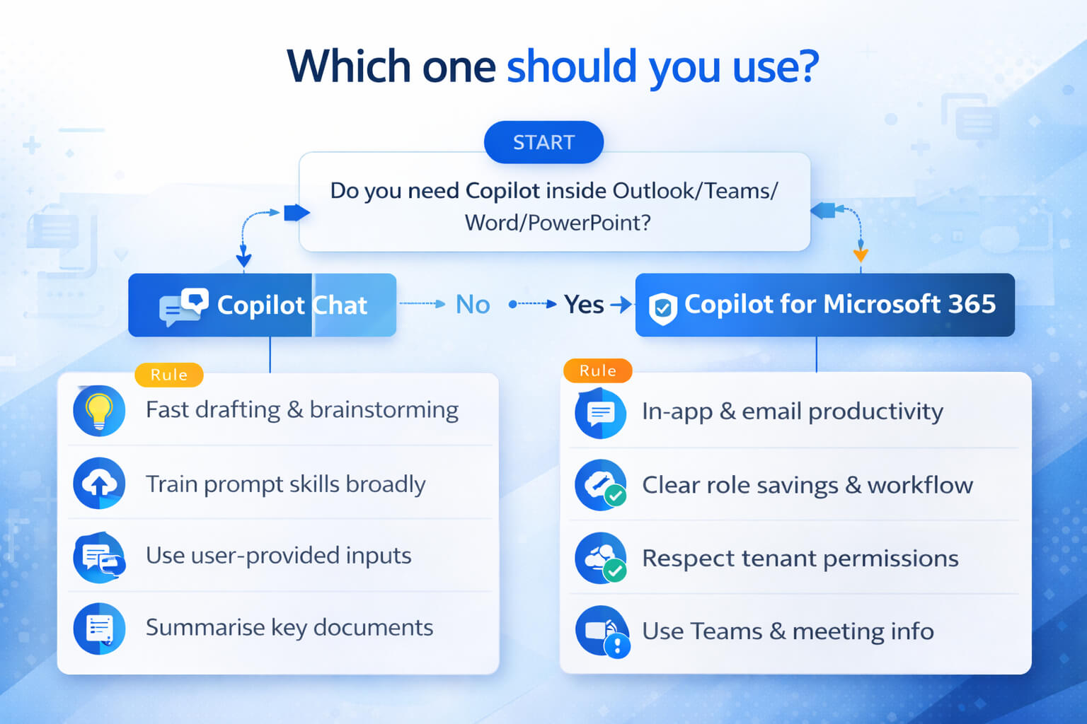 If you want a straightforward starting point: roll out Copilot Chat broadly with prompt training and safe use guidance, then pilot Microsoft 365 Copilot in a focused group where you can measure time savings. This reduces cost risk and avoids the “we bought licences but nobody uses it” scenario.